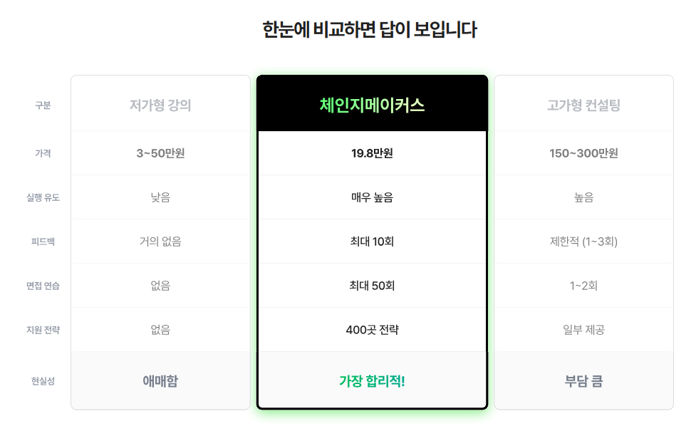 이러한 복잡한 역설계 과정을 혼자서 해내기란 쉽지 않습니다. 그래서 **체인지메이커스(ChangeMakers)**는 단순히 예쁜 문장을 만들어주는 첨삭 서비스를 거부합니다. 우리는 단 4주라는 짧은 시간 안에 당신을 방구석 '준비생'에서, **'수백 개의 지원 기록을 가진 실전 플레이어'**로 변화시킵니다.