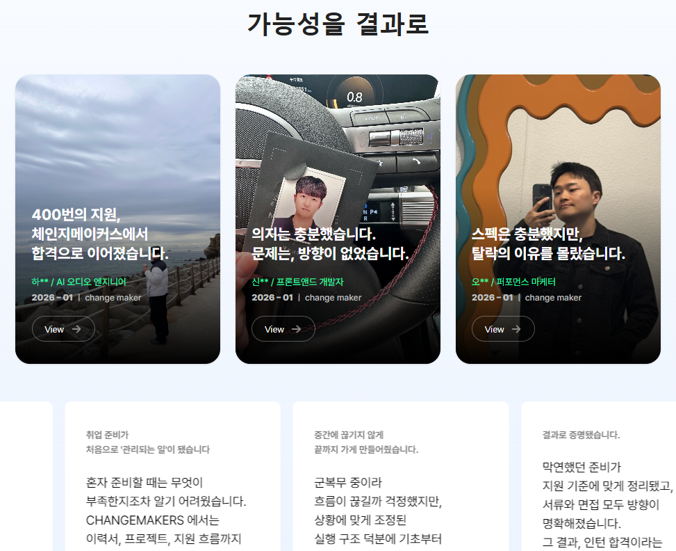 | [체인지메이커스 실제 후기] 비전공자 부트캠프 출신, 5개월의 서류 광탈을 끊어낸 진짜 이유 (0) | 2026.02.25 |