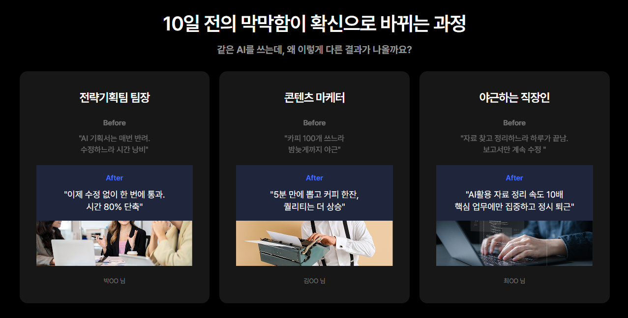 이러한 한계를 완벽하게 깨부수고, 실리콘밸리 1% 리더들의 사고방식을 우리 조직과 실무에 그대로 이식할 수 있는 압도적인 클래스가 있어 추천하고자 합니다. 바로 모두의 AI [직장인 마스터 클래스]입니다.