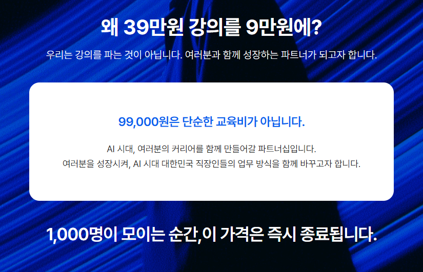 현재 이 마스터 클래스는 런칭 기념으로 정가 39만 원의 과정을 9만 9천 원이라는 파격적인 얼리버드 특가로 제공하고 있습니다. 선착순 1,000명 한정으로 진행되며, 기한이 지나면 정가로 인상될 예정입니다.