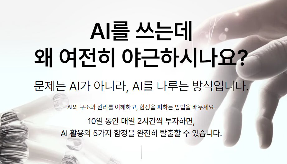 문제는 AI의 성능이 아닙니다. AI를 다루는 여러분의 '방식'과 '구조'에 있습니다. 오늘은 단순한 툴 사용법을 넘어, 여러분의 업무 패러다임을 완전히 바꿔놓을 단 하나의 솔루션, '모두의 AI 직장인 마스터 클래스'에 대해 말씀드리려 합니다.