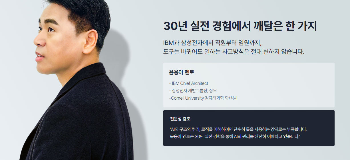 이 클래스를 이끄는 윤웅아 멘토는 차원이 다른 권위를 증명합니다. 90년대부터 코넬대학교에서 컴퓨터과학(AI)을 전공하고, 글로벌 인공지능의 시초격인 미국 IBM 왓슨(Watson)의 핵심 개발자(Chief Architect)를 역임했습니다. 또한 대한민국 대표 AI 서비스인 삼성전자 빅스비(Bixby)의 런칭을 총괄한 글로벌 임원 출신입니다.