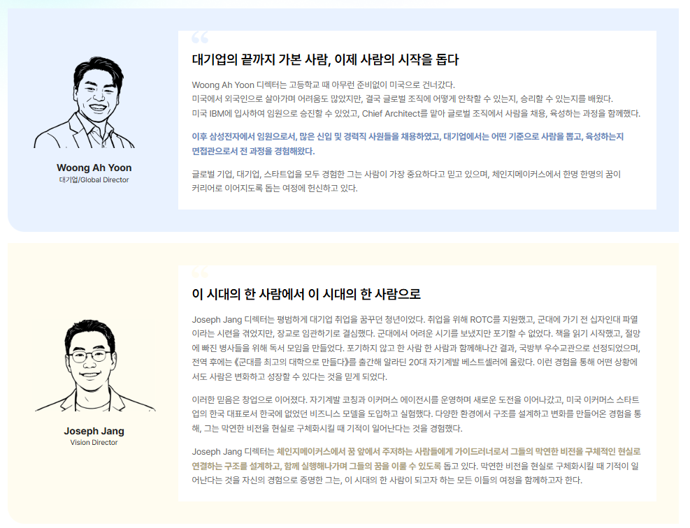 이러한 통찰력 있는 피드백은 결코 평범한 강사에게서 나올 수 없습니다. 체인지메이커스가 흔한 취업 학원과 궤를 달리하는 이유는 바로 합격의 판을 짜는 디렉터진의 압도적인 라인업에 있습니다.