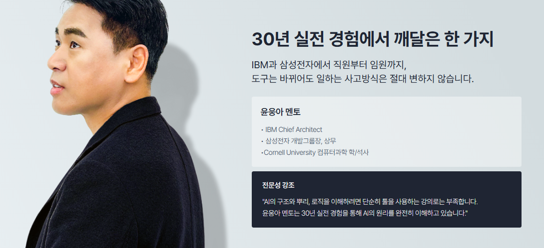 실리콘밸리 임원 출신의 상위 1% 실무 노하우, Cornell University 컴퓨터과학 전공, 삼성전자 상무 출신 윤웅아 멘토의 30년 실전 노하우를 배울 수 있습니다.