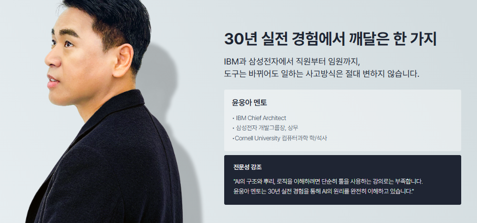 이 클래스가 다른 모든 강의를 압도하는 첫 번째 이유는 강사진의 '넘사벽' 커리어입니다. 코넬대(Cornell Univ.) 컴퓨터과학(CS) 정통 전공자에, 전 IBM AI·블록체인 최고 임원(수석 아키텍트), 그리고 전 삼성전자 개발 그룹장 상무를 역임하신 윤웅아 멘토님이 직접 강의하십니다.