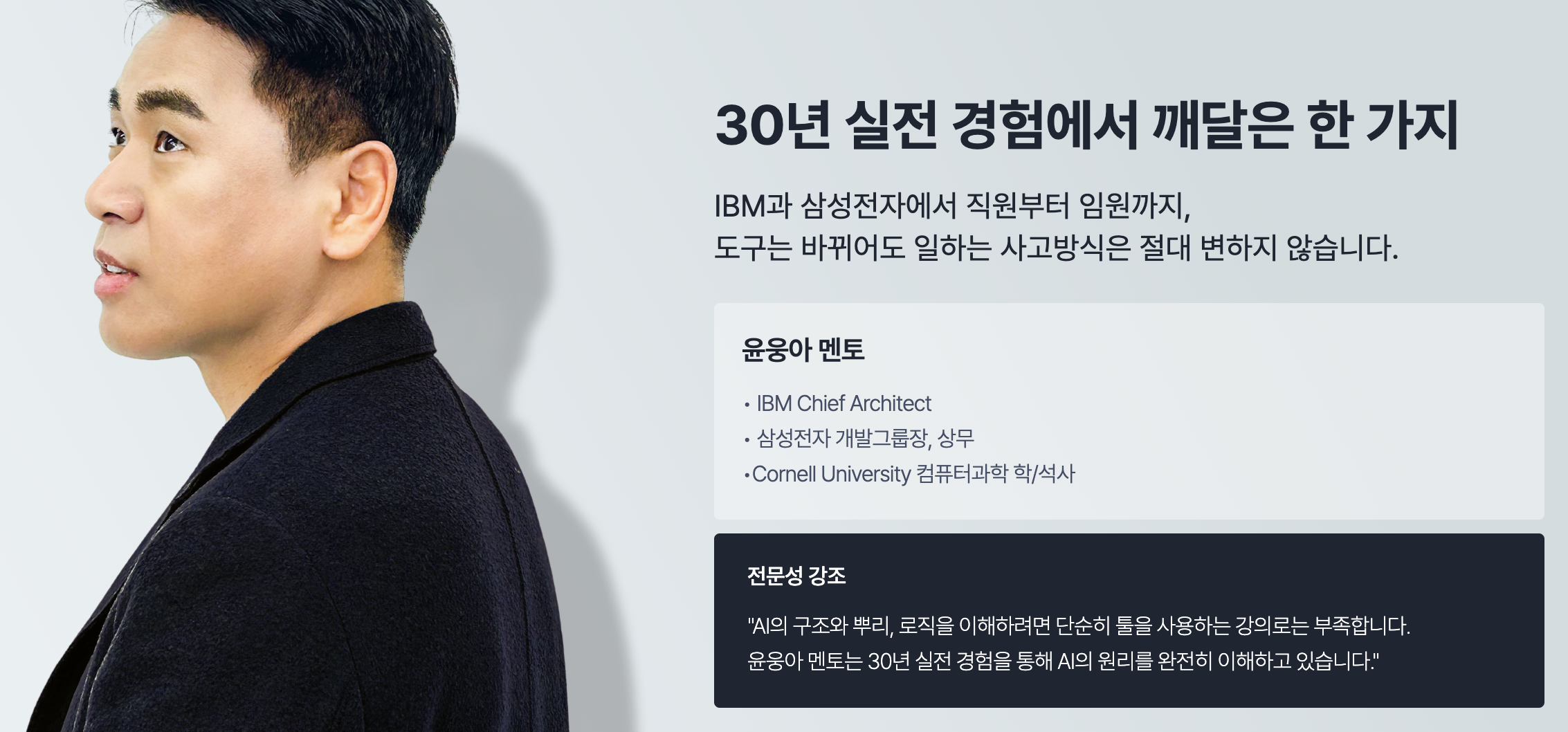 이 클래스를 이끄는 윤웅아 멘토님은 미국 코넬대(Cornell Univ.) 컴퓨터과학 전공자이자, 전 IBM 수석 아키텍트, 그리고 전 삼성전자 상무(개발그룹장)를 역임하신 분입니다. 실리콘밸리의 글로벌 스탠다드와 까다로운 국내 최고 기업의 임원진을 모두 만족시켜 본 '진짜 리더'의 시각에서 AI를 다루는 법을 배울 수 있습니다.