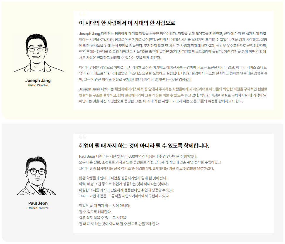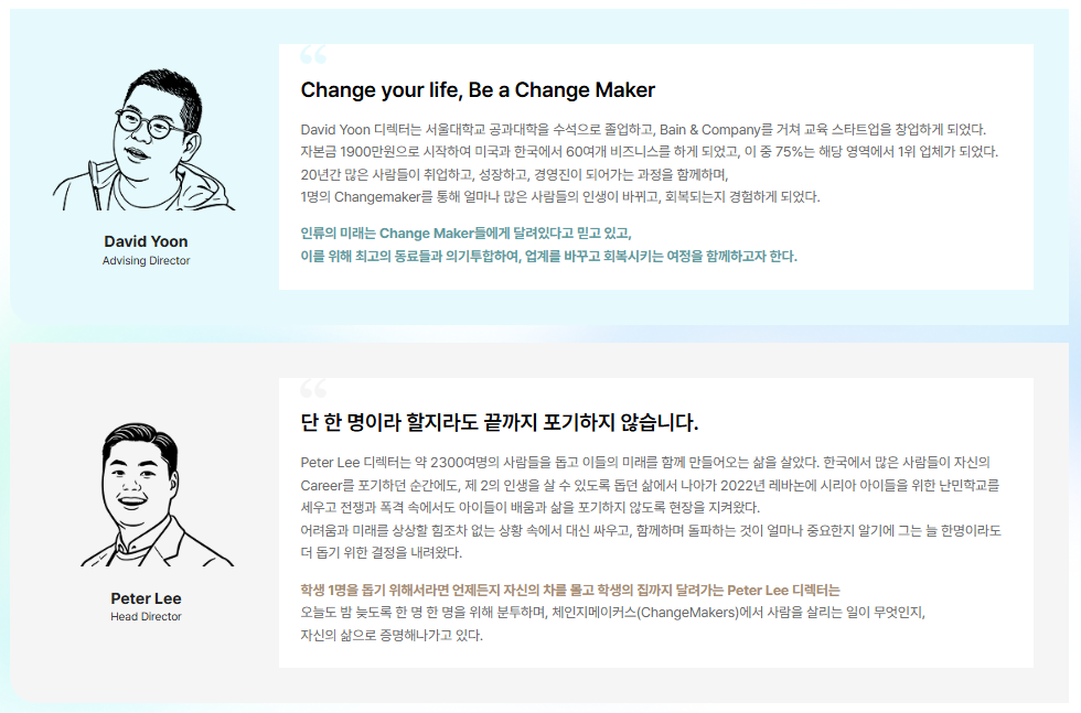 한 사람도 혼자 포기하게 두지 않습니다. 체인지메이커스 전문 디렉터 팀이 취업 준비부터 성장까지 함께합니다.